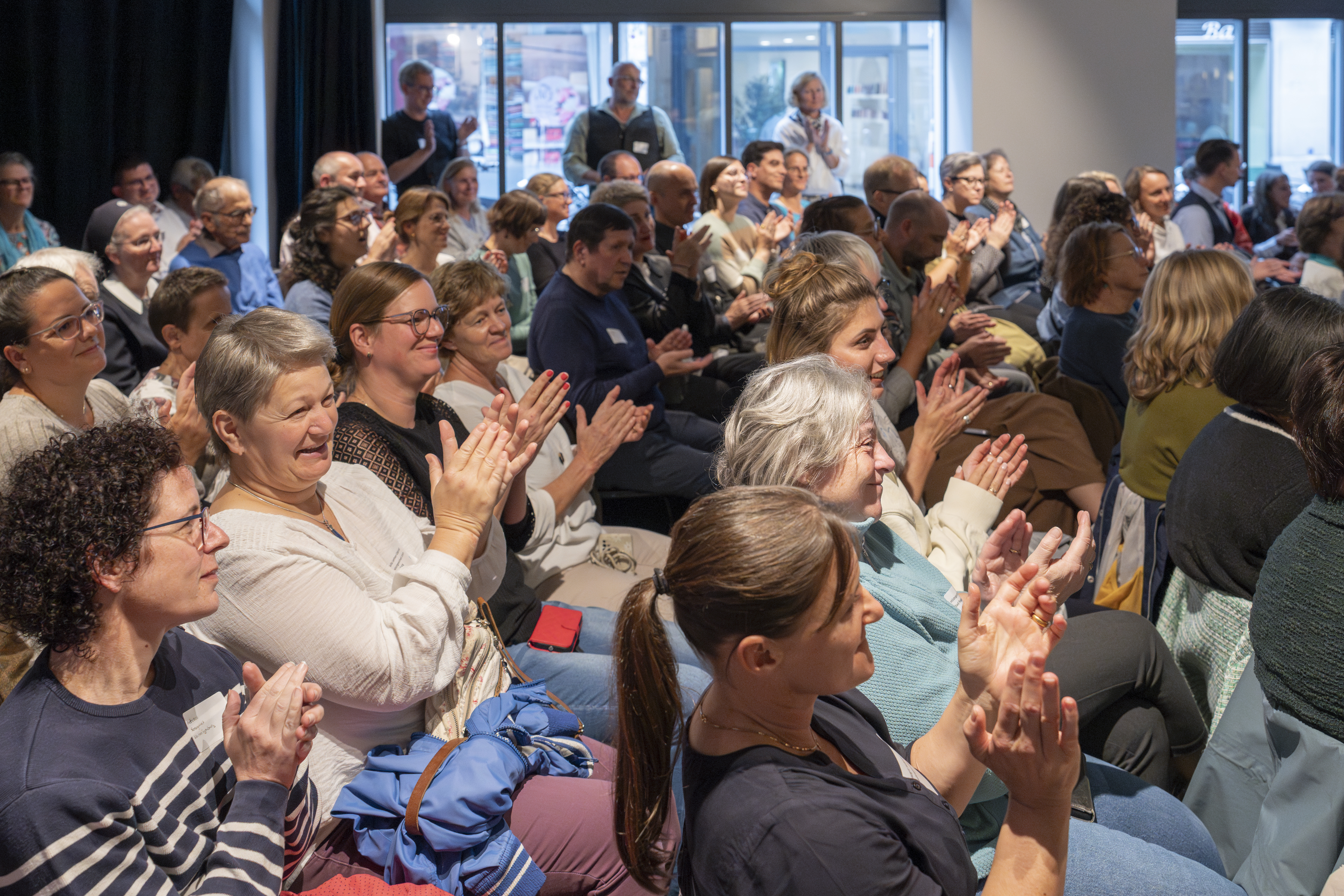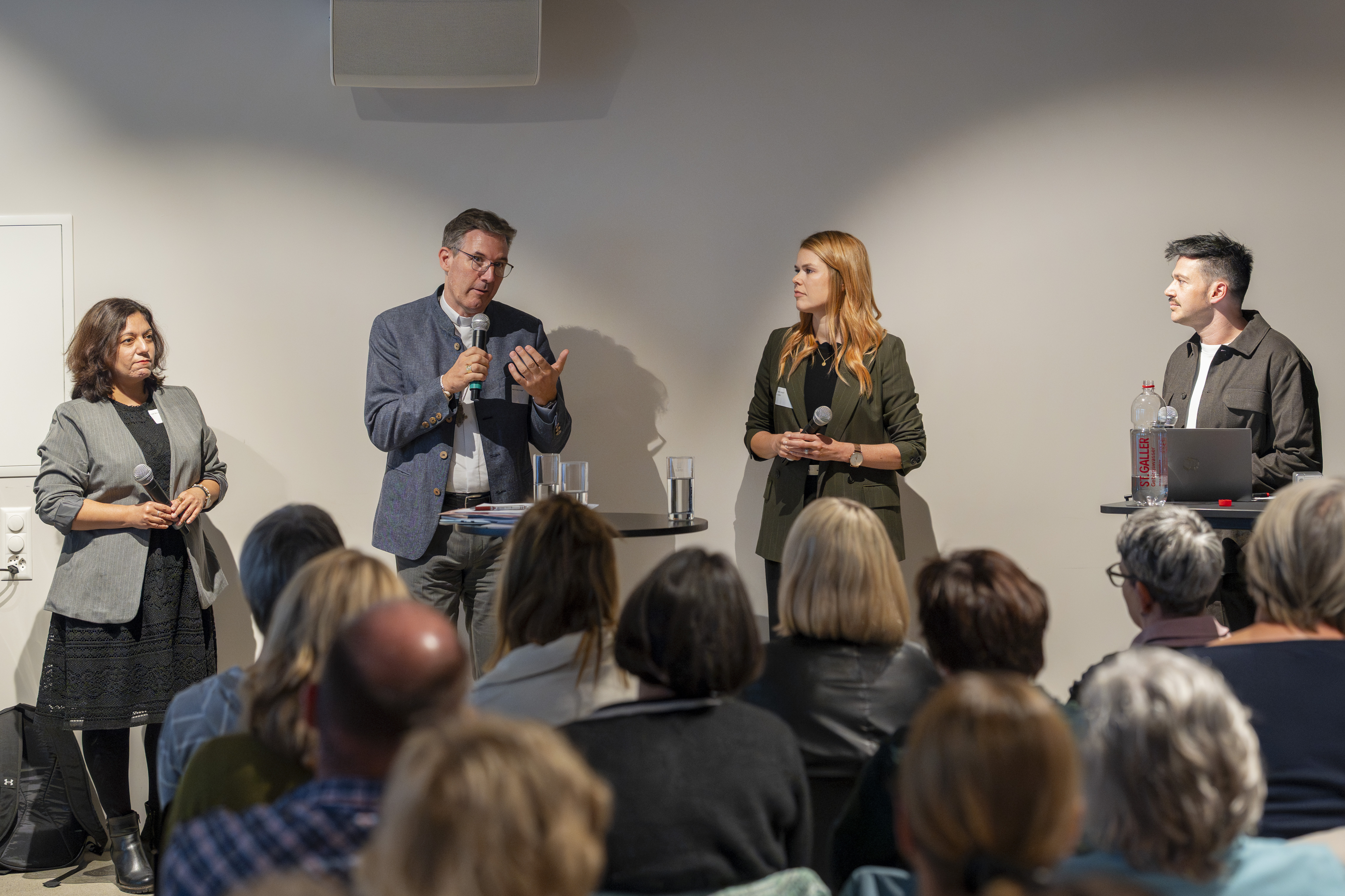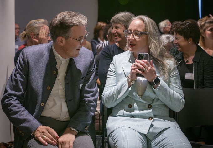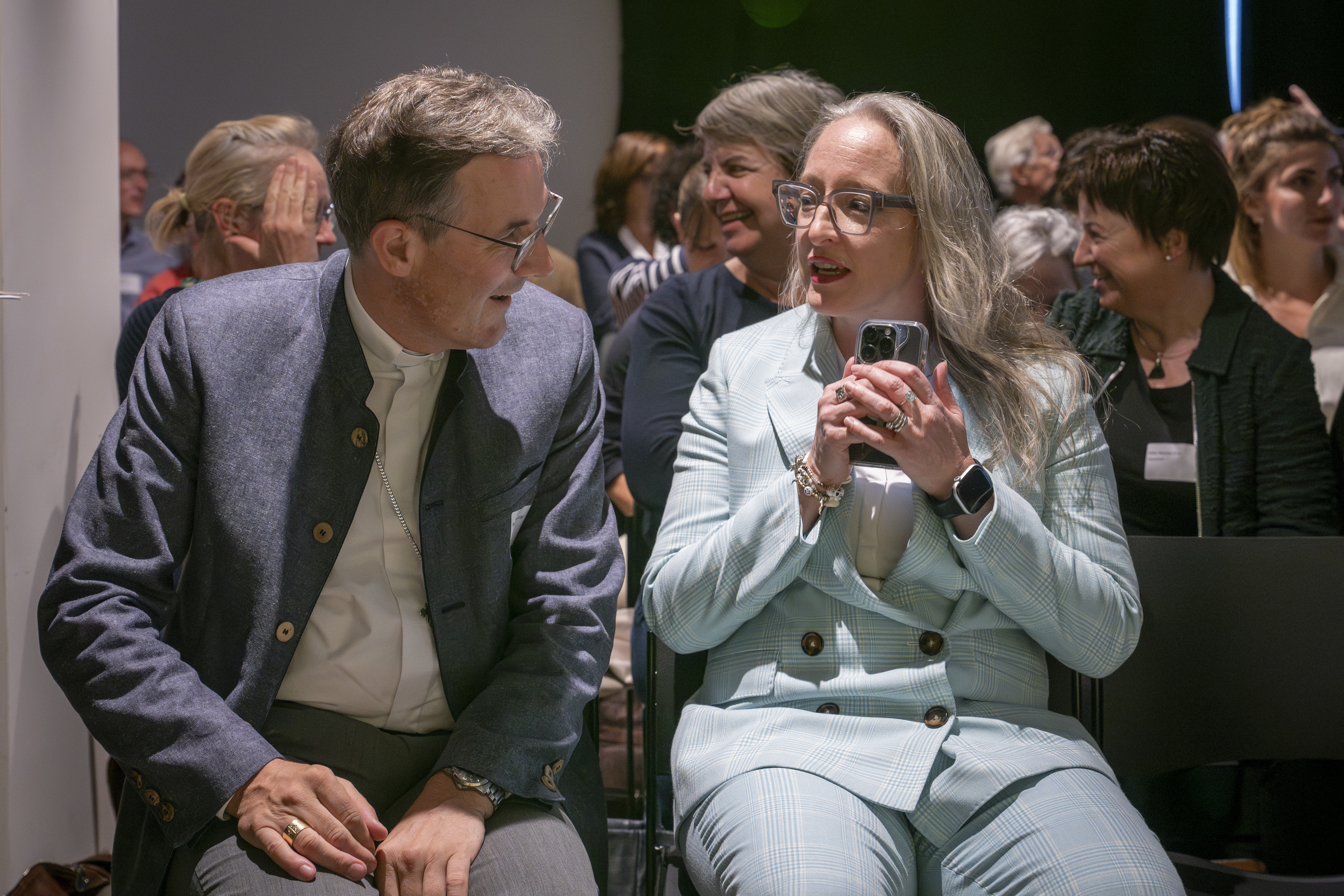 An der Podiumsdiskussion stellten sich Isabel Vasquez von Migratio, Claudia Vetsch von der Daju (Diözesanen Arbeitsstelle für Jugendpastoral im Bistum St.Gallen) und Bischof Beat Grögli den Fragen von Redaktionsleiter Stephan Sigg. «40 Prozent der Gläubigen haben Migrationshintergrund, für viele ist Deutsch nicht Muttersprache», hielt Isabel Vasquez, Nationaldirektorin von Migratio, eine Dienststelle der Schweizer Bischofskonferenz, fest. Oft höre sie, dass sich Pfarreien schwertun, mit Missionen und Anderssprachigen in Kontakt zu kommen. «Da braucht es manchmal Geduld und auch den Mut zu Experimenten.» Sie illustrierte das mit einem einfachen Beispiel: Eine Pfarrei verschickte den Brief mit dem Absender der Spanier-Seelsorge und stiess bei den Spanischsprechenden plötzlich auf Resonanz. Isabel Vasquez ermutigte zu ersten Schritten: «Nicht einfach nur Anlässe der Missionen zu besuchen, sondern auch im normalen Alltag mit ihnen Kontakt aufnehmen und Einblicke in ihren Alltag bekommen.» Eine wichtige Grundlage sei Fremdsprachenkompetenz. «Aber genauso wichtig ist es, im Alltag auf eine einfache, gut verständliche Sprache zu versetzen. Die Texte möglichst kompakt halten, Aufzählungen statt endlose Sätze». Der St.Galler Bischof zeigte sich gewohnt offen und volksnah. Mit Stephan Sigg sprach er von seinen Erfahrungen über eine Kommunikation, die die Menschen erreicht. Er achte immer darauf, authentisch, positiv, fröhlich, reflektiert und ermutigend zu sein. «Jeder Mensch lebt von dem, das ihn freut.» Bischof Beat Grögli ging weiter auf die Spannungen auf der Welt ein. «Es ist eine Bubble-Kultur entstanden. Diese müssen wir aufbrechen. Wir müssen auch unterschiedliche Meinungen zulassen.» Claudia Vetsch vertrat die Sicht der jungen Menschen. Mit dem Projekt Churching.ch hat die Daju ein Angebot für ebendiese Zielgruppe geschaffen – keine einfache Zielgruppe, wie auch Redaktionsleiter Stephan Sigg weiss. «Junge suchen Menschen mit Ecken und Kanten, mit Profil», so Claudia Vetsch. «Wir müssen uns zeigen, ein vis-a-vis sein und von den eigenen Erfahrungen sprechen. So können wir nahbar sein für die Jungen.»