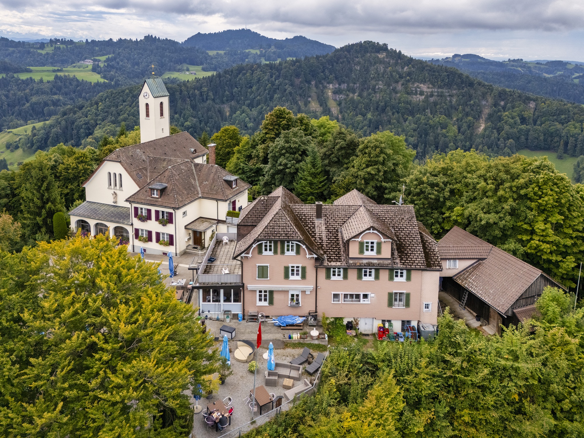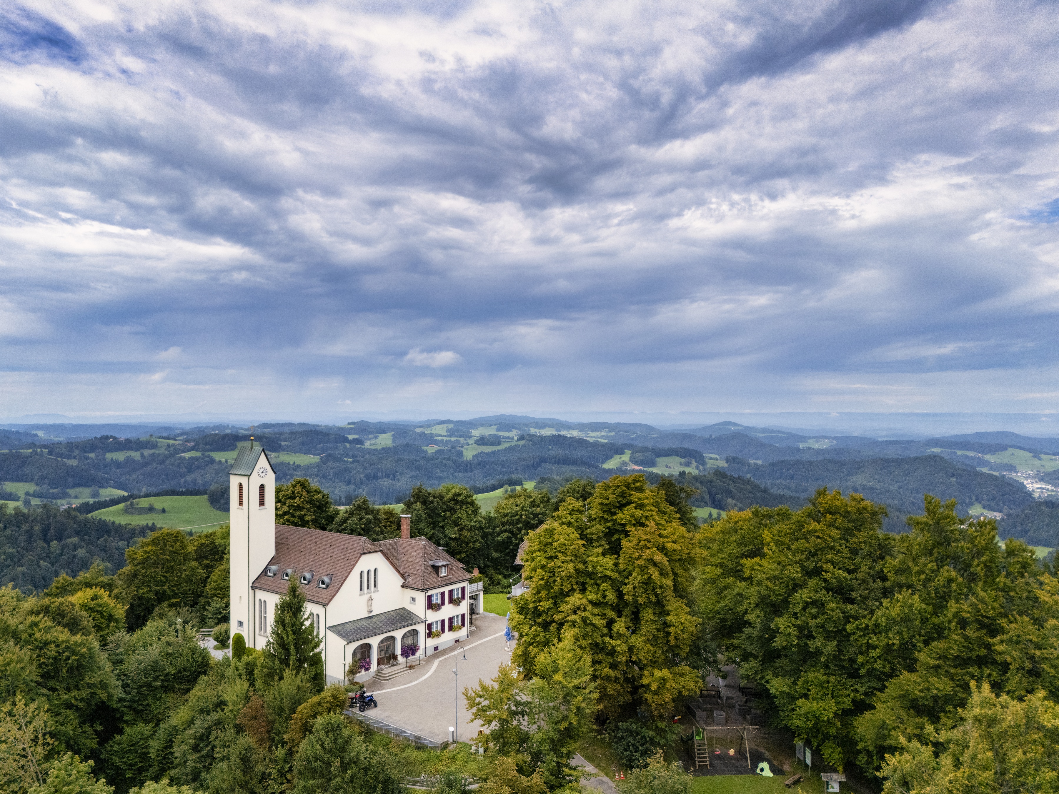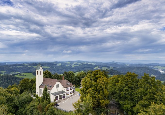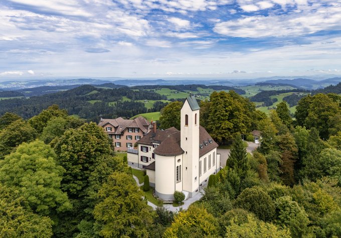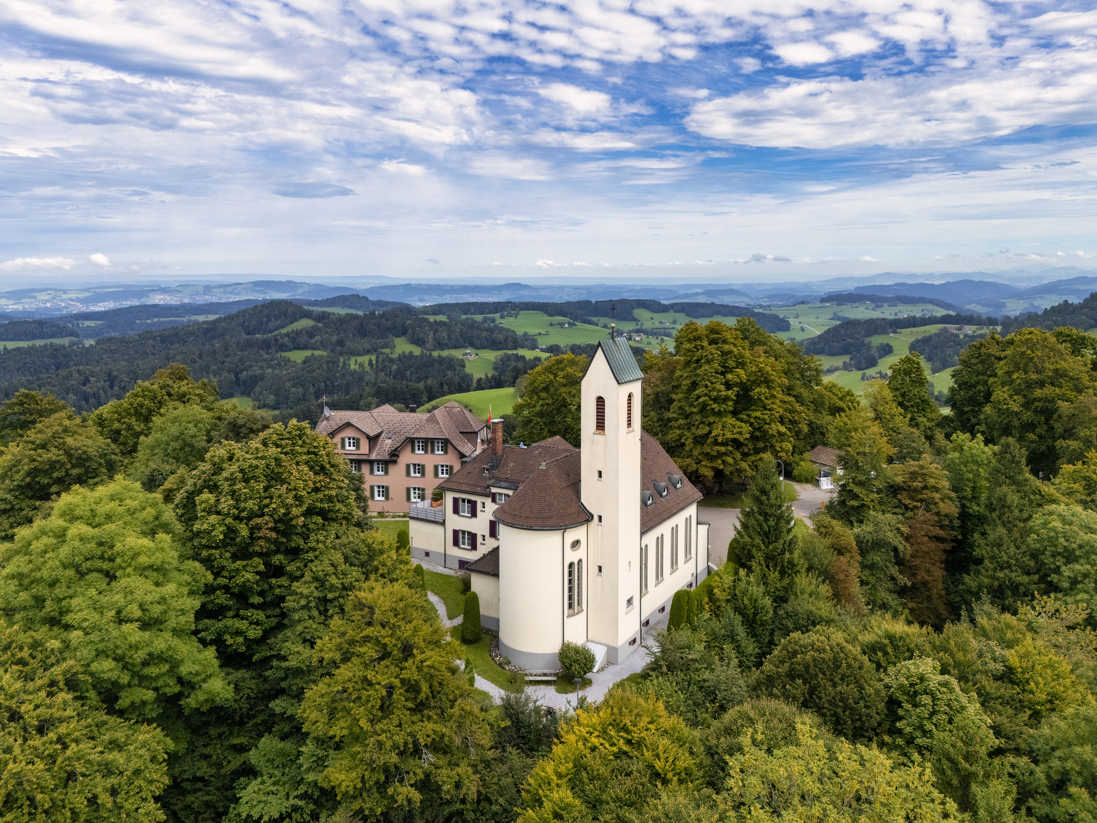 Eine Tafel mitten auf der Terrasse des Gasthauses St. Iddaburg verweist auf die Absturzstelle der Heiligen Idda. Hans Steuble vom Freundeskreis Iddaburg blickt zum Kloster Fischingen hinunter. Dort befindet sich das Grab der Heiligen Idda. Allerdings ist es leer und es sind keine Reliquien von ihr erhalten. Heute gehört der Wallfahrtsort der Stiftung St. Iddaburg und ist kirchlich dem Bischof von St. Gallen zugeteilt. Der Freundeskreis Iddaburg unterstützt die Stiftung unter anderem ideell und materiell darin, die Anlagen und Gebäude des Wallfahrtsortes langfristig zu erhalten. Der Ort ist ein bisschen in die Jahre gekommen. Das Gasthaus neben der Kirche wird demnächst geschlossen und soll abgerissen werden (siehe Seite 16). Ein Neubau ist geplant. «Es ist wichtig, einen einmaligen Ort wie diesen zu bewahren und in ihn zu investieren», sagt Hans Steuble und führt zum Anschlagbrett bei der Kirche. Dort hängen die Visualisierungen des Projektes «Trinitas». Diese zeigen ein modernes, einladendes Gasthaus mit grossen Fensterscheiben, das sich in die Landschaft einfügt. Das Gebäude hat die Form eines gleichschenkligen Dreiecks, womit es Bezug auf die christliche Symbolik der Dreifaltigkeit, also auf Vater, Sohn und Heiligen Geist, nimmt. Frühestens ab 2028 soll einkehren können, wer zur Iddaburg eine Wallfahrt macht, Zwischenhalt auf einer Pilgerreise einlegt oder etwa eine Wanderung unternimmt.