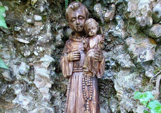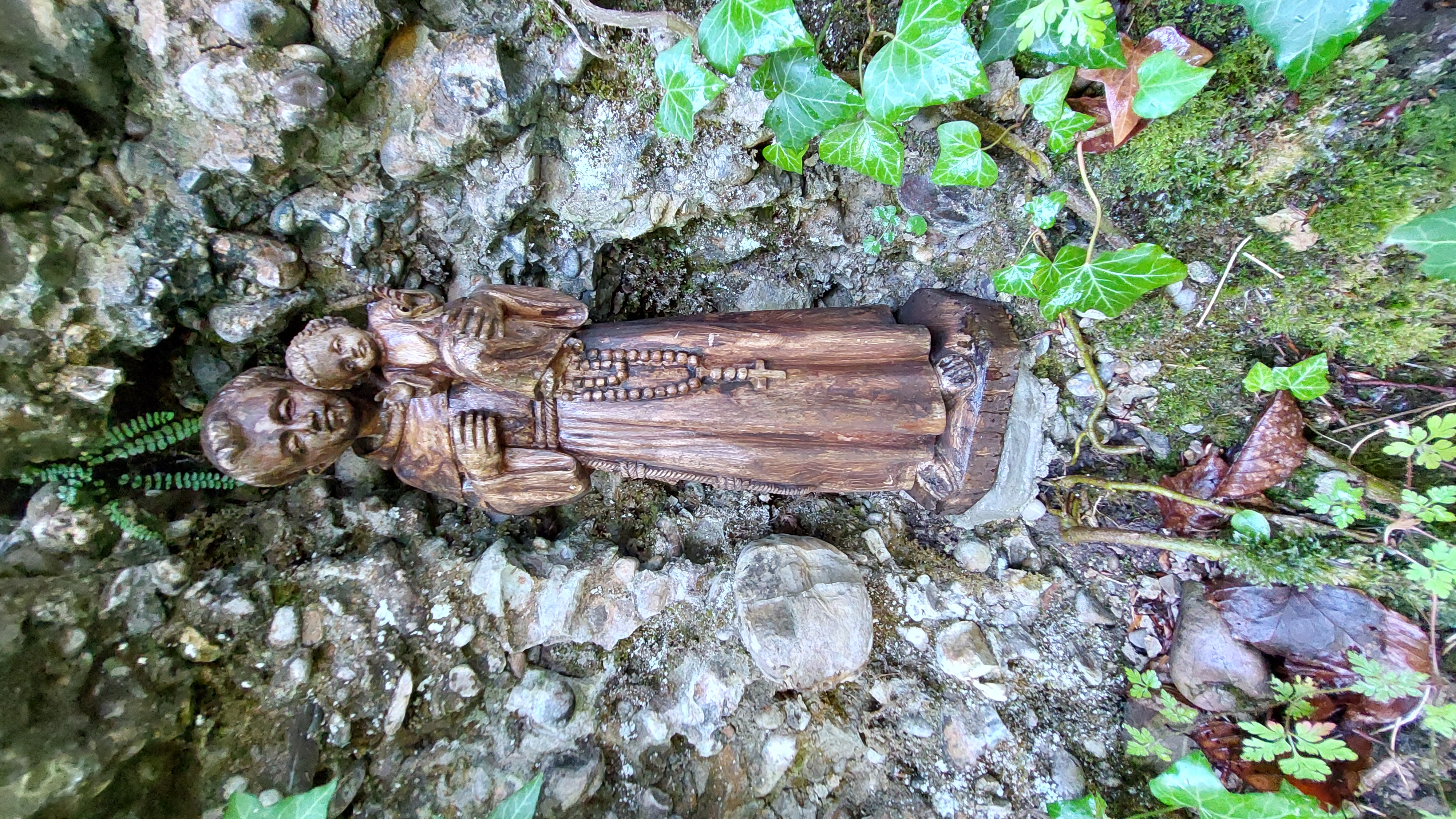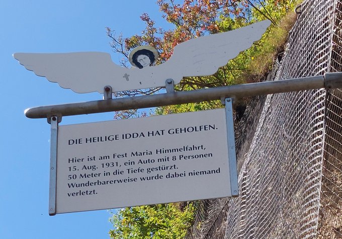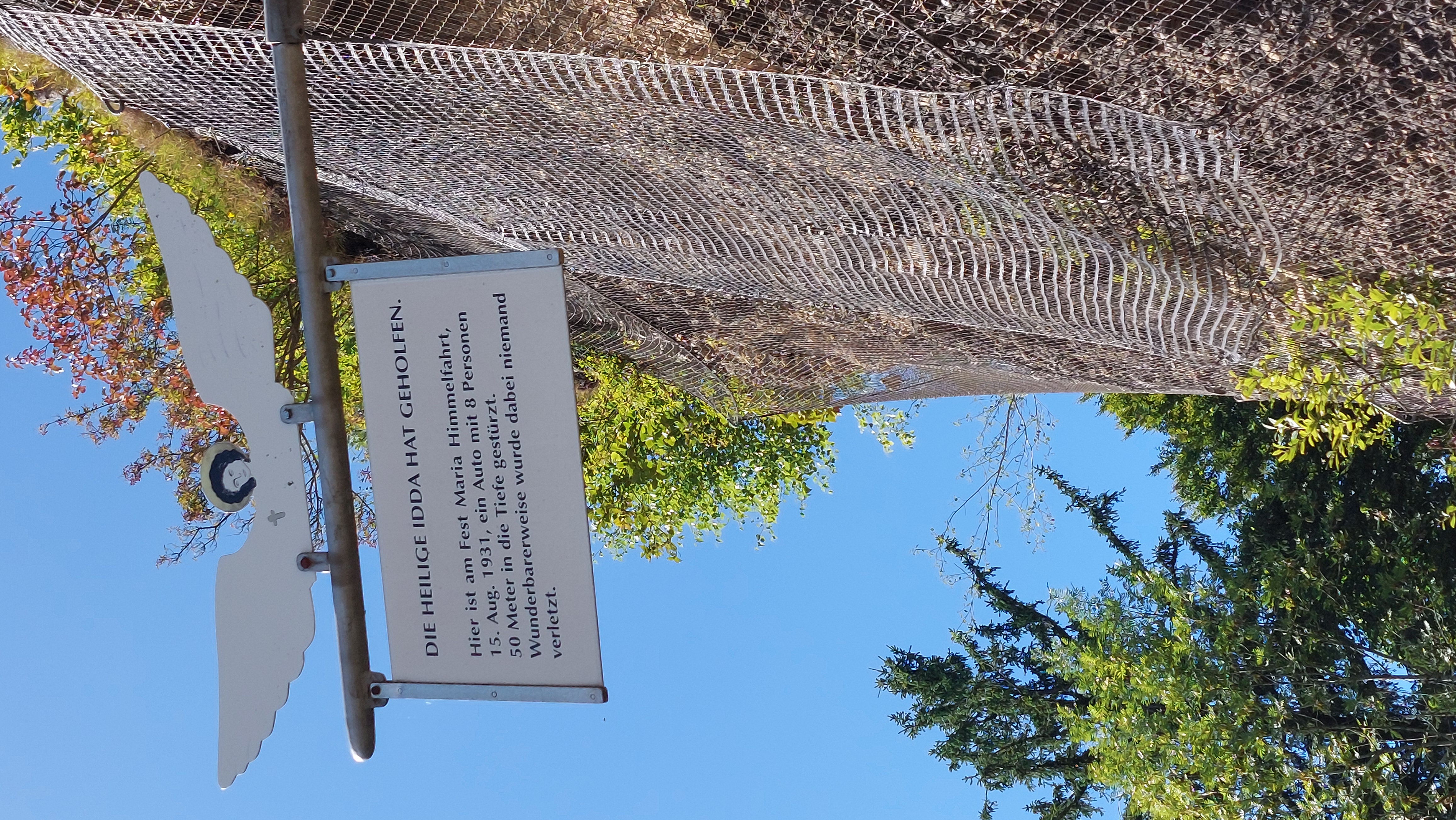 Bei der Wallfahrtskirche sind auf Wegweisern nicht weniger als 21 Wanderrouten ausgeschildert. Spontan folge ich dem Wegweiser in Richtung Gähwil und tauche in dichten Wald ein. Eine Abzweigung führt zur Lourdesgrotte. Unter einer Überdachung aus Holz finden sich einige Bänke, Kerzen, ein Altar und eine Marienstatue im Felsen dahinter. Ein schmaler Weg, der mit einem Geländer gesichert ist, führt am Felshang entlang. Die Bäume geben hin und wieder den Blick in die sonnige Ebene hinunter bis zum Bodensee frei. Es gibt auch einen alten Kreuzweg mit Innschriften. Ein anderer Weg führt zurück auf die geteerte Strasse etwas unterhalb der Iddaburg. Mit dem Velo geht es ab jetzt schnell und steil hinunter. Ein Blick zurück unterbricht die Abfahrt nochmals kurz. Hoch oben am Felsen ist ein Engel befestigt. «Die Heilige Idda hat geholfen», steht dort. Und: «Hier ist am 15. August 1931 ein Auto mit 8 Personen 50 Meter in die Tiefe gestürzt. Wunderbarerweise wurde dabei niemand verletzt.» Da kann die Heimfahrt nur gelingen.