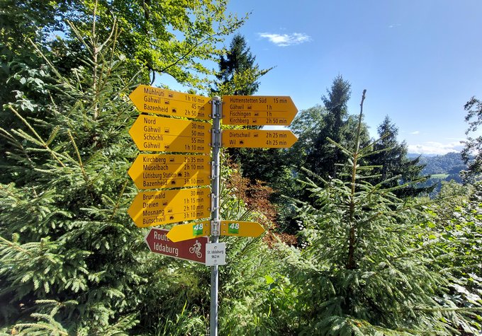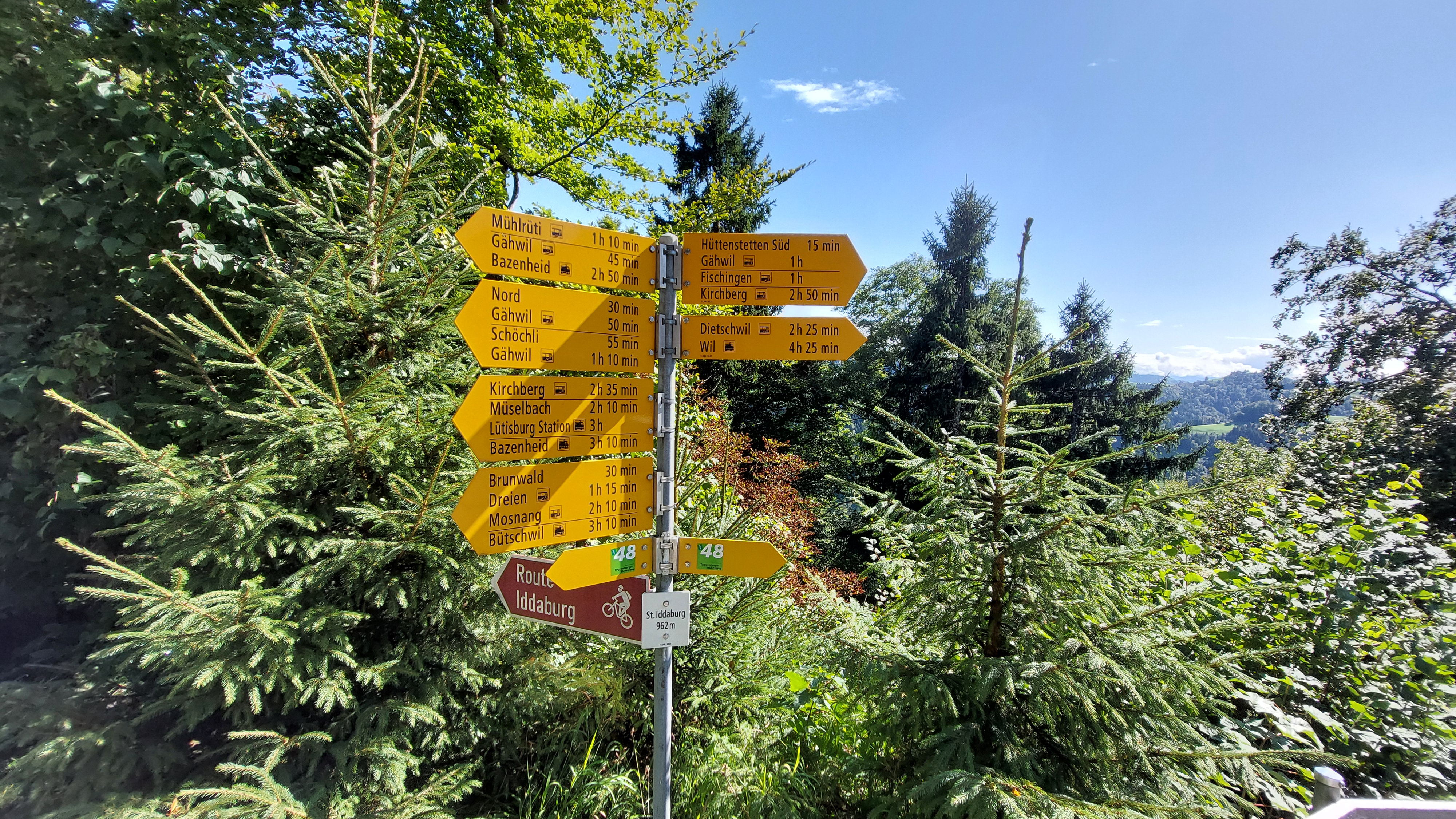 Die drei Frauen, von denen eine aus Australien zu Besuch ist, schauen aber in die Ferne. Am Horizont zeichnet sich der Bodensee ab. Davor liegen Hügel und Wälder. «Echt sieht es nicht aus. Eher wie ein Gemälde, auf dem alles ganz bewusst platziert ist. Selbst die Sonnenstrahlen», sagt eine der Frauen. «Die Aussicht ist so wunderschön.»Die Aussicht ist wirklich beeindruckend. Das Beste ist, dass an diesem frühen Freitagnachmittag keine weiteren Besucher auf der Iddaburg sind. Später, kurz vor Beginn der Freitagsmesse, wird sich der Parkplatz vor der Kirche aber füllen. Nun liegt aber Ruhe über dem Ort. Schon auf der «80-Strecke» ab Gähwil ist kein einziges Auto unterwegs. Es herrschen perfekte Bedingungen für Velofahrerinnen und Velofahrer. Zur Iddaburg geht es steil hinauf. Sie liegt auf 966 Metern über Meer. Überall sind Wander- sowie verschiedene Bike- und Velorouten ausgeschildert. Die Regenwolken haben sich gerade erst verzogen und die Erde dampft unter den Sonnenstrahlen, die jetzt auf die Erde knallen. Es gilt Höhenmeter um Höhemeter zu erkämpfen. Je höher man kommt, desto felsiger wird die Umgebung. Auf den Felsen wachsen Bäume und fast hat man den Eindruck, in einer südlicher gelegenen Gegend unterwegs zu sein.