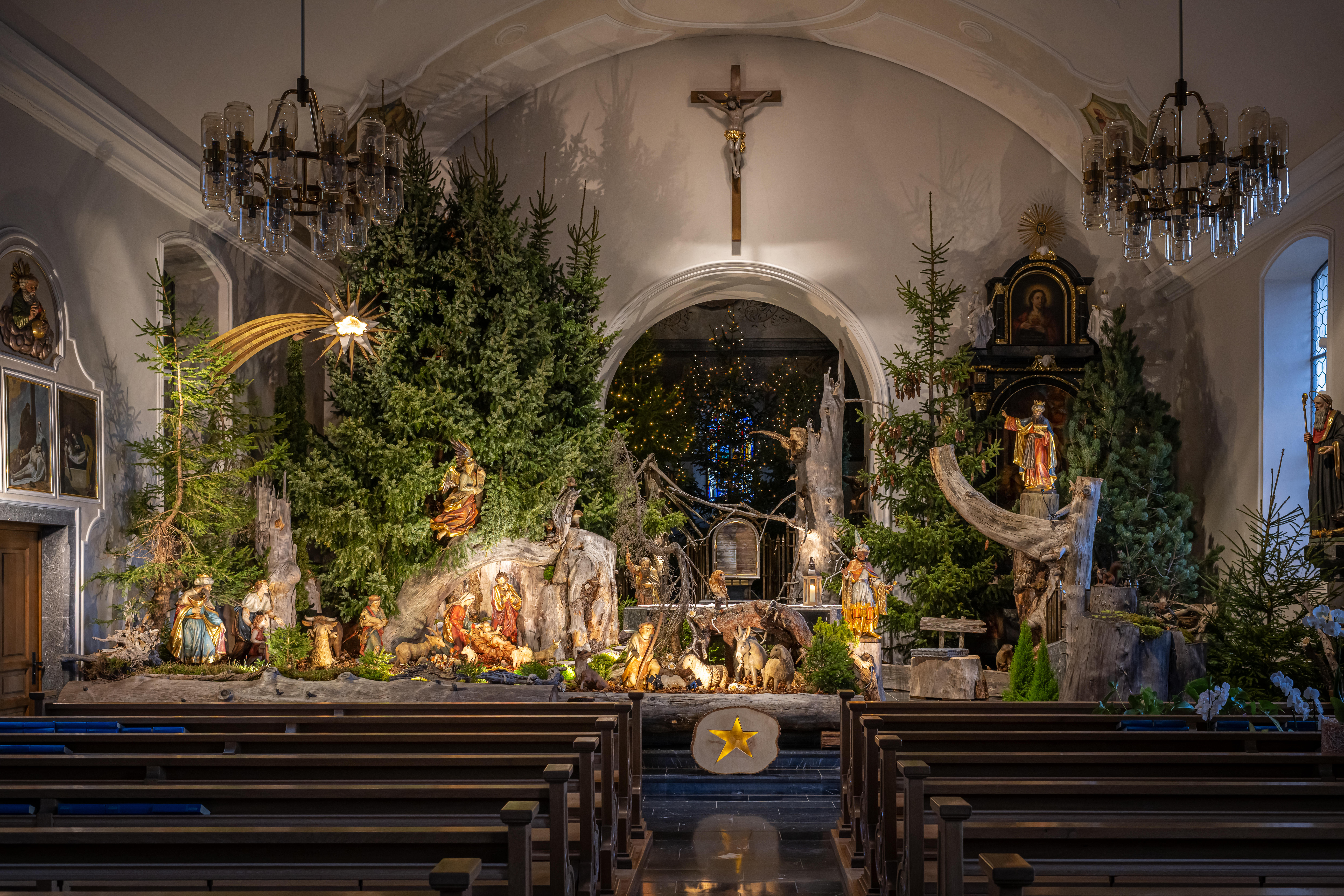 Alleine schon die Fahrt nach Amden lohnt sich. Das Postauto schlängelt sich die steile Strasse durch Felsengalerien hinauf. Unten glitzert der Walensee silbrig-grau im Novemberlicht. Das Dorf selbst auf rund 950 Metern über Meer steckt im Nebel fest. Hinter dem Kirchturm ragt eine schneebedeckte Bergspitze aus den Wolken. Knapp erkennbar ist auch der alte Sessellift am dorfseitigen Hang, der das kleine Skigebiet erschliesst. «Wir leben hier vor allem von den Tagestouristinnen und -touristen», sagt Rolf Böni. Der 59-Jährige ist Mesmer in der Galluskirche. Diese ist für ihre Ammlerkrippe über die Region hinaus berühmt. Auch dank Rolf Böni. Während des ganzen Advents ist er hinter den abgeschlossenen Türen der Kirche damit beschäftigt, den Chor- und Altarraum auszuräumen und die riesige deckenhohe Krippenlandschaft aufzubauen. Jedes Jahr entwirft er die Kulisse komplett neu. Zuvor ist er während der warmen Monate in den Wäldern, Bergen und auf den Alpwiesen der Region unterwegs, um geeignete Wurzelstöcke, Baumstämme, Moose, Flechten, Disteln und viele weiteren Dinge zu sammeln oder mit einem Landwirtschaftsfahrzeug samt Kran abzutransportieren. Überraschung ist am 24. Dezember: Ab dann fahren Reisebusse aus Österreich, Deutschland, Italien und verschiedenen Schweizer Regionen den kleinen Ort mit gut 1800 Einwohnerinnen und Einwohnern an, um die Ammlerkrippe zu bestaunen.
