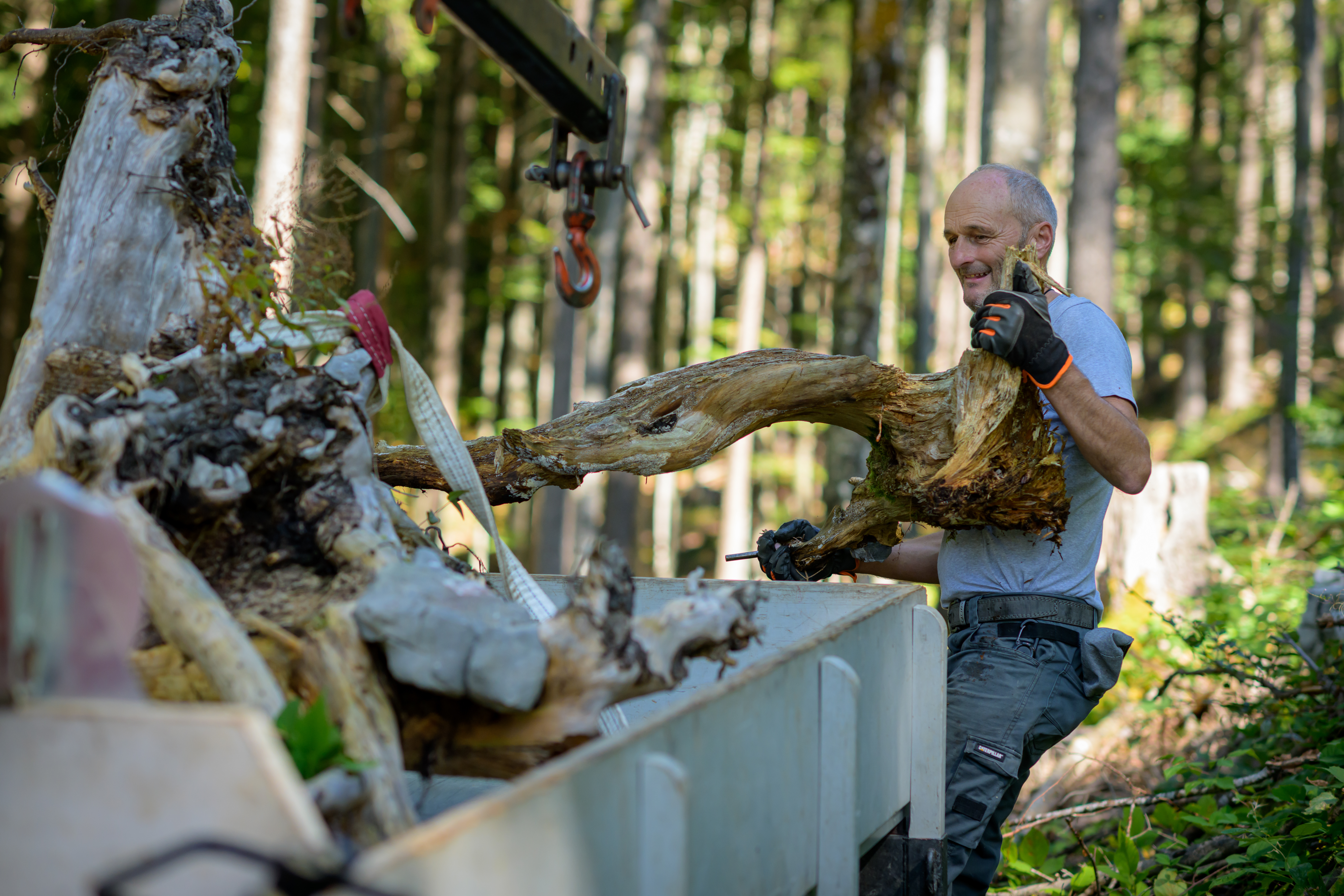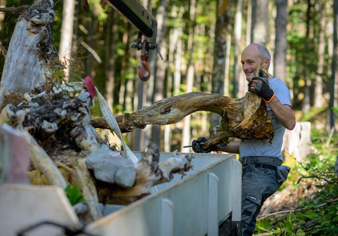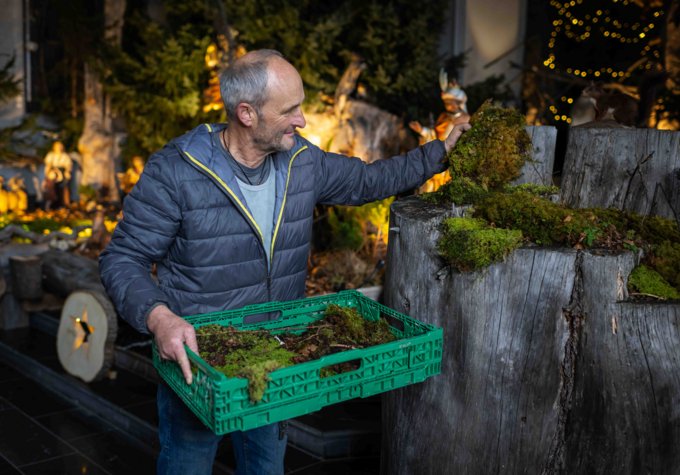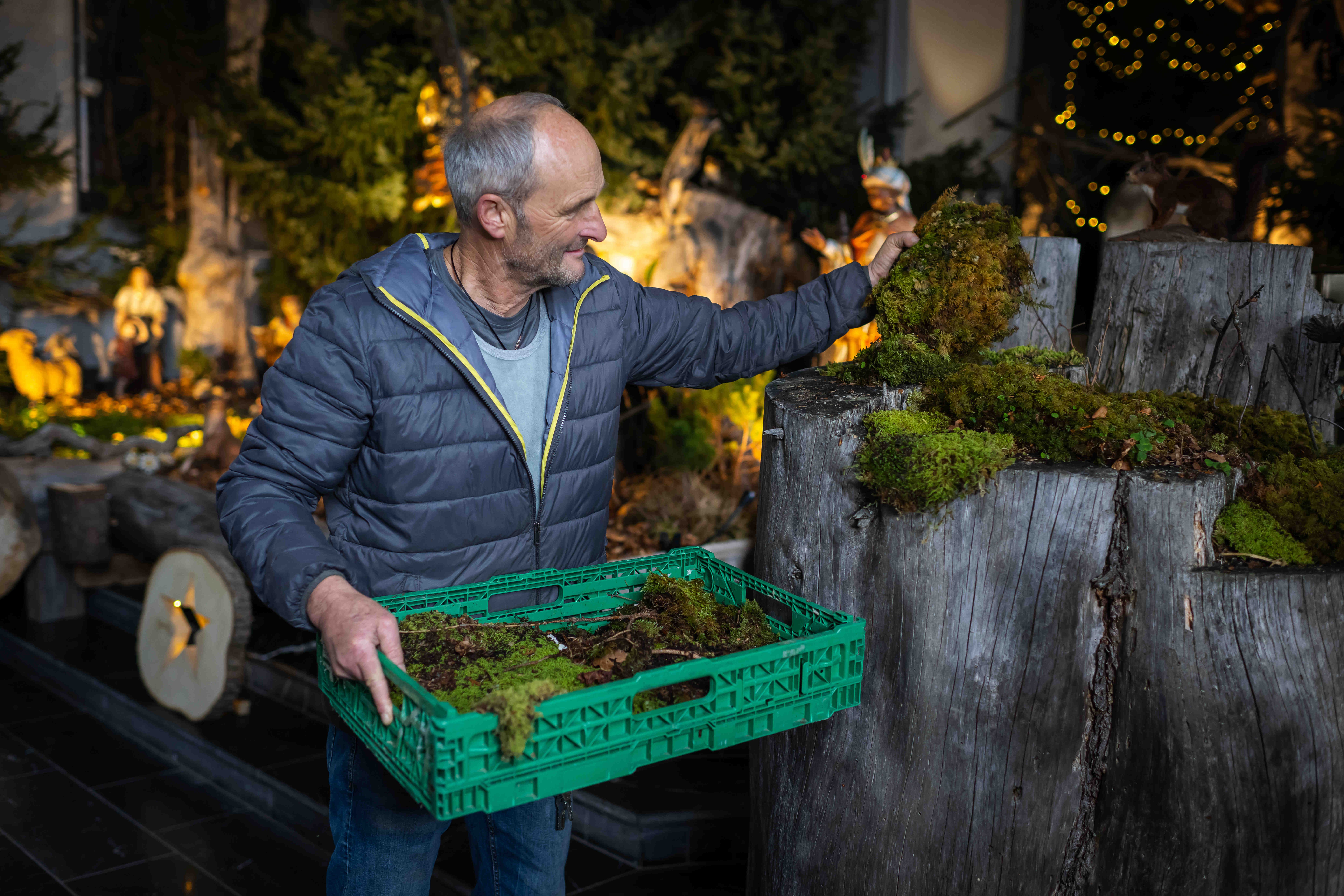 «Die Natur zu durchstreifen und die Augen nach geeigneten Dingen offen zu halten, ist beinahe eine Sucht geworden», sagt Rolf Böni und erzählt, wie er bereits im Frühling zu ersten Streifzügen in das Gebiet vom Unteren Toggenburg bis zu den Gipfeln von Speer, Leistchamm und Mattstock aufbricht. «Dann wachsen noch keine Farne und man sieht durch das Dickicht hindurch.» Entdeckt Rolf Böni etwas Geeignetes, markiert er auf seinem Smartphone die Koordinaten. Im Spätsommer und Herbst kommt er mit einem Transportfahrzeug an diesen Orten vorbei. Kurz vor dem Advent liegen viele der Materialien draussen vor der Kirche bereit, die er aus den Bergen herbeigeschafft hat. So lagert auch in diesem Jahr ein riesiger Baumstamm auf zwei Paletten. Er ist von unzähligen kleinen Tannen überwachsen. Hinter dem Pfarrhaus hat er die Kisten voller Moos deponiert und gleich vor der Kirchentür liegt auf einem Palettenhubwagen ein abgesägter und ein Tonnen schwerer Wurzelstock. «Manchmal sind meine Fundstücke so gross, dass sie nicht durch die Tür passen. Dann bleibt nur das Zersägen und anschliessende Zusammensetzen in der Kirche», sagt er. Das Konzept und die Pläne für die Krippe entstehen jeweils während Rolf Böni in der Natur unterwegs ist. «In manchen Jahren entdecke ich besonders schönes Silbergraues in der Natur. In anderen Jahren finde ich mehr Grünes und Moosiges. So setzt sich in meinem Kopf jeweils das Krippenbild zusammen und ich weiss genau, wie es aussehen wird», sagt er. Die Krippe baut er grösstenteils alleine zusammen, manchmal bieten ihm Personen aus dem Dorf Hilfe an. Bei den schweren Arbeiten kann er auf die Unterstützung von seinen Brüdern und Kollegen zurückgreifen. Die Kabel verlegen, die Lampen anbringen, dekorieren, die Pumpanlage für den kleinen künstlich Bach anlegen, der in jedem Jahr durch die Kirche fliesst: Auch das gehört zu seiner Arbeit. Ist alles aufgebaut, kommt das tägliche Besprühen und Giessen hinzu. «Sonst würde die Krippe innert Tagen braun und vertrocknet aussehen», sagt er. Generell hat die Ammlerkrippe seinen Blick geschärft. Etwa für Kleines und scheinbar Unscheinbares. Sind die Krippenbesucherinnen und -besucher weg, erwacht das Nachtleben. Da kriechen kleine Schnecken, marschieren Ameisen, zeigen sich Käfer und Spinnen. Er staune regelmässig darüber, wie viel Leben in einem toten Baum stecke. Weil ein toter Baum also nicht wirklich tot ist, geht er mit allen anderen Dingen, die sich Rolf Böni von der Natur ausgeborgt hat, auch wieder dorthin zurück. «Es ist nachhaltig, die Dinge zurück in ihren Kreislauf zu geben», sagt er.