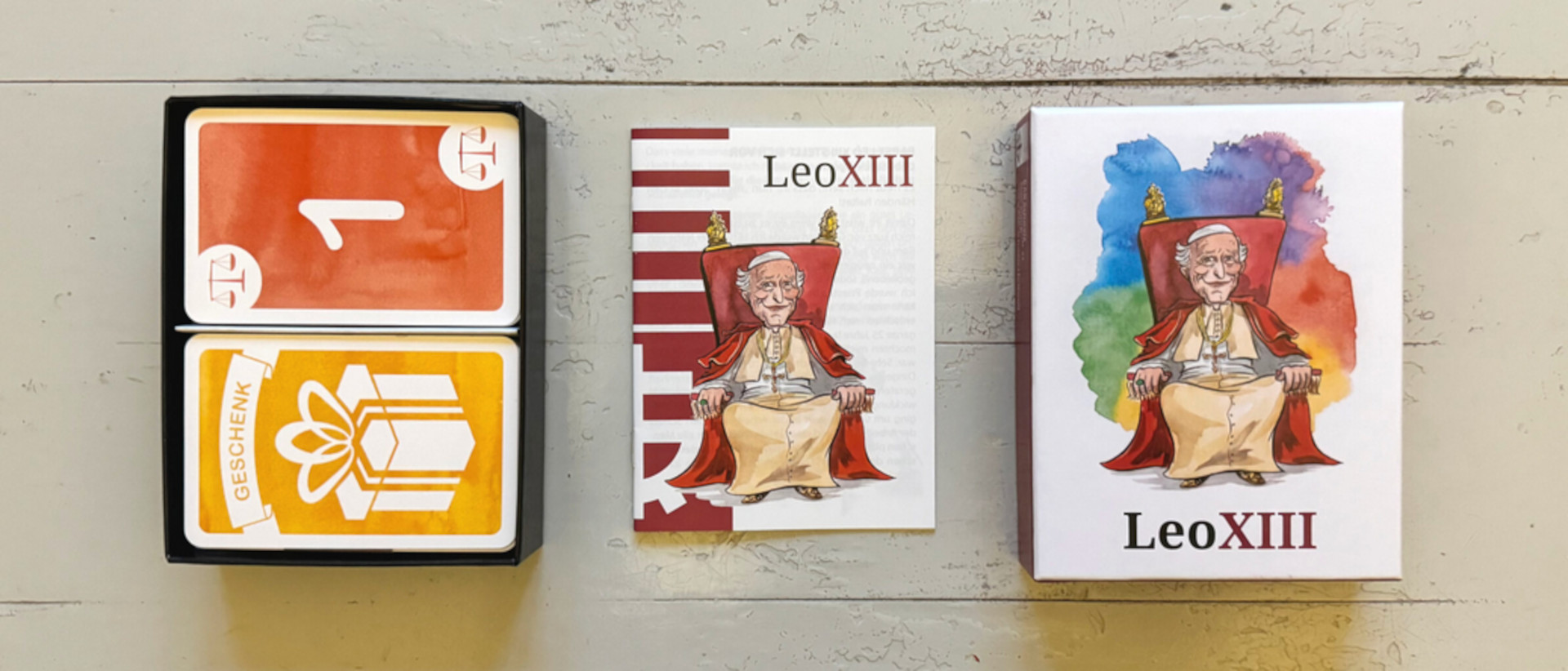 «Leo XIII» erinnert ein wenig an den Kartenspiel-Klassiker UNO. Dabei argumentieren die Spielenden im Wettkampf untereinander mit Argumenten der katholischen Soziallehre und versuchen mit diesen, die diesbezüglich drängenden Probleme dieser Welt zu lösen. Auch wenn die Solidarität und gemeinschaftliches Handeln für das Gute im Zentrum stehen, versuchen sich doch alle Spielenden als möglichst erfolgreiche Streiter für die katholische Soziallehre darzustellen, um den Platz auf dem Siegerthron zu ergattern – nach dem Vorbild von Papst Leo XIII. im roten Gewand auf dem Papstthron, welcher im Jahr 1891 die Grundlagen für die katholische Soziallehre legte.