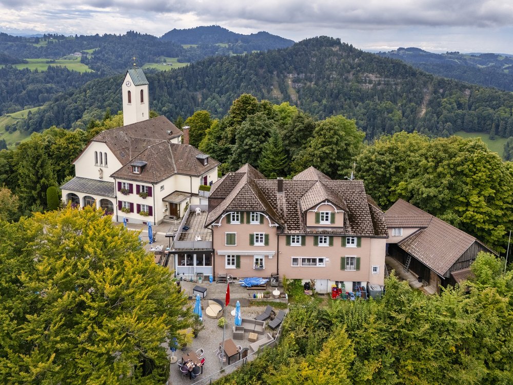 Eine Tafel mitten auf der Terrasse des Gasthauses St. Iddaburg verweist auf die Absturzstelle der Heiligen Idda. Hans Steuble vom Freundeskreis Iddaburg blickt zum Kloster Fischingen hinunter. Dort befindet sich das Grab der Heiligen Idda. Allerdings ist es leer und es sind keine Reliquien von ihr erhalten. Heute gehört der Wallfahrtsort der Stiftung St. Iddaburg und ist kirchlich dem Bischof von St. Gallen zugeteilt. Der Freundeskreis Iddaburg unterstützt die Stiftung unter anderem ideell und materiell darin, die Anlagen und Gebäude des Wallfahrtsortes langfristig zu erhalten. Der Ort ist ein bisschen in die Jahre gekommen. Das Gasthaus neben der Kirche wird demnächst geschlossen und soll abgerissen werden (siehe Seite 16). Ein Neubau ist geplant. «Es ist wichtig, einen einmaligen Ort wie diesen zu bewahren und in ihn zu investieren», sagt Hans Steuble und führt zum Anschlagbrett bei der Kirche. Dort hängen die Visualisierungen des Projektes «Trinitas». Diese zeigen ein modernes, einladendes Gasthaus mit grossen Fensterscheiben, das sich in die Landschaft einfügt. Das Gebäude hat die Form eines gleichschenkligen Dreiecks, womit es Bezug auf die christliche Symbolik der Dreifaltigkeit, also auf Vater, Sohn und Heiligen Geist, nimmt. Frühestens ab 2028 soll einkehren können, wer zur Iddaburg eine Wallfahrt macht, Zwischenhalt auf einer Pilgerreise einlegt oder etwa eine Wanderung unternimmt.
