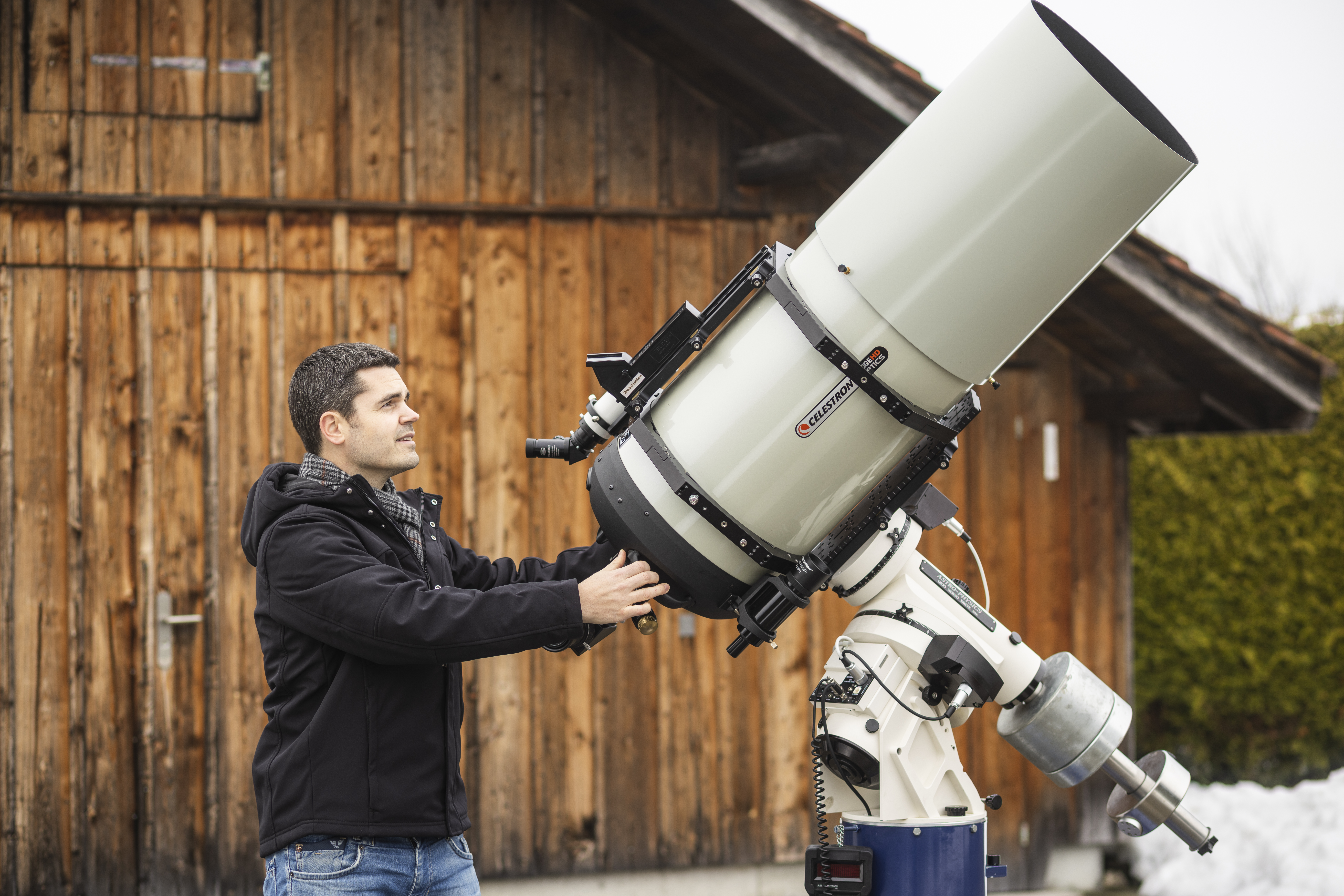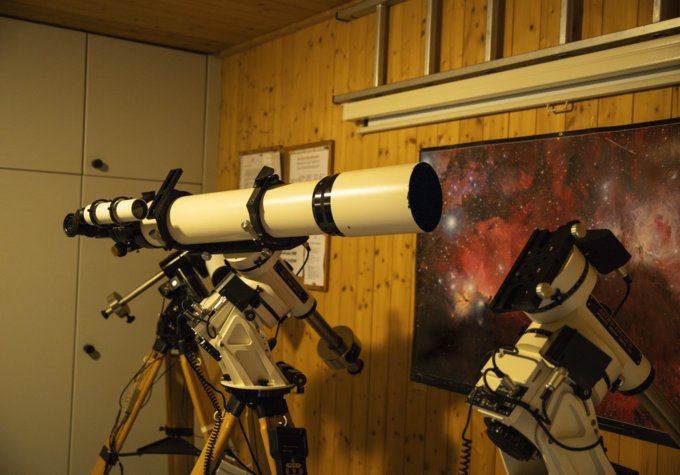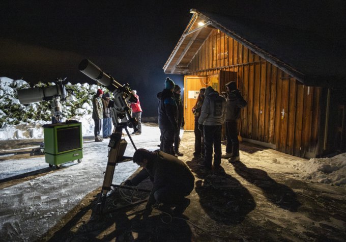 In einer der kältesten Nächte des Jahres die Sternwarte zu besuchen, habe auch Vorteile, sagt Nico Wohlwend im Hinblick auf den Besuch der Pfadileiterinnen und Pfadileiter. Der Himmel sei dann klarer und die Sterne und Planeten liessen sich besser betrachten. Fabian Neyer stimmt ihm zu. Gemeinsam schaufeln sie die letzten Meter Schnee vom Vorplatz, fahren das Spiegelreflexteleskop und den Refraktor, ein Linsenteleskop, auf der Bodenschiene unter den freien Himmel. Dann richten sie die Geräte auf den Nordstern aus. Auf einem kleinen Computer sind die Koordinaten weiterer Himmelskörper abgespeichert. Per Knopfdruck finden die Teleskope so jeweils in die entsprechende Position.